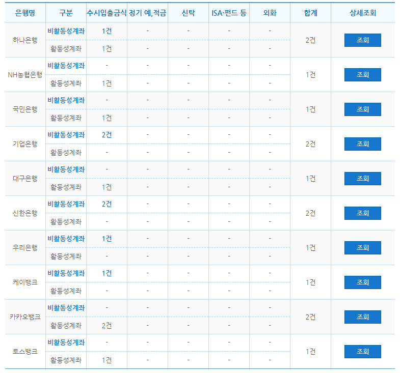 통장을 개설한 은행들이 조회가 됩니다. 이제 상세 조회에 있는 조회버튼을 눌러보겠습니다.