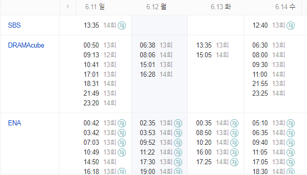5개의 채널에서 재방송 정주행이 가능합니다. 아래의 실시간 재방송 시간을 확인하시고 시간대에 볼 수 없다면 웨이브 또는 디즈니에서 다시보기를 해주셔야 합니다.