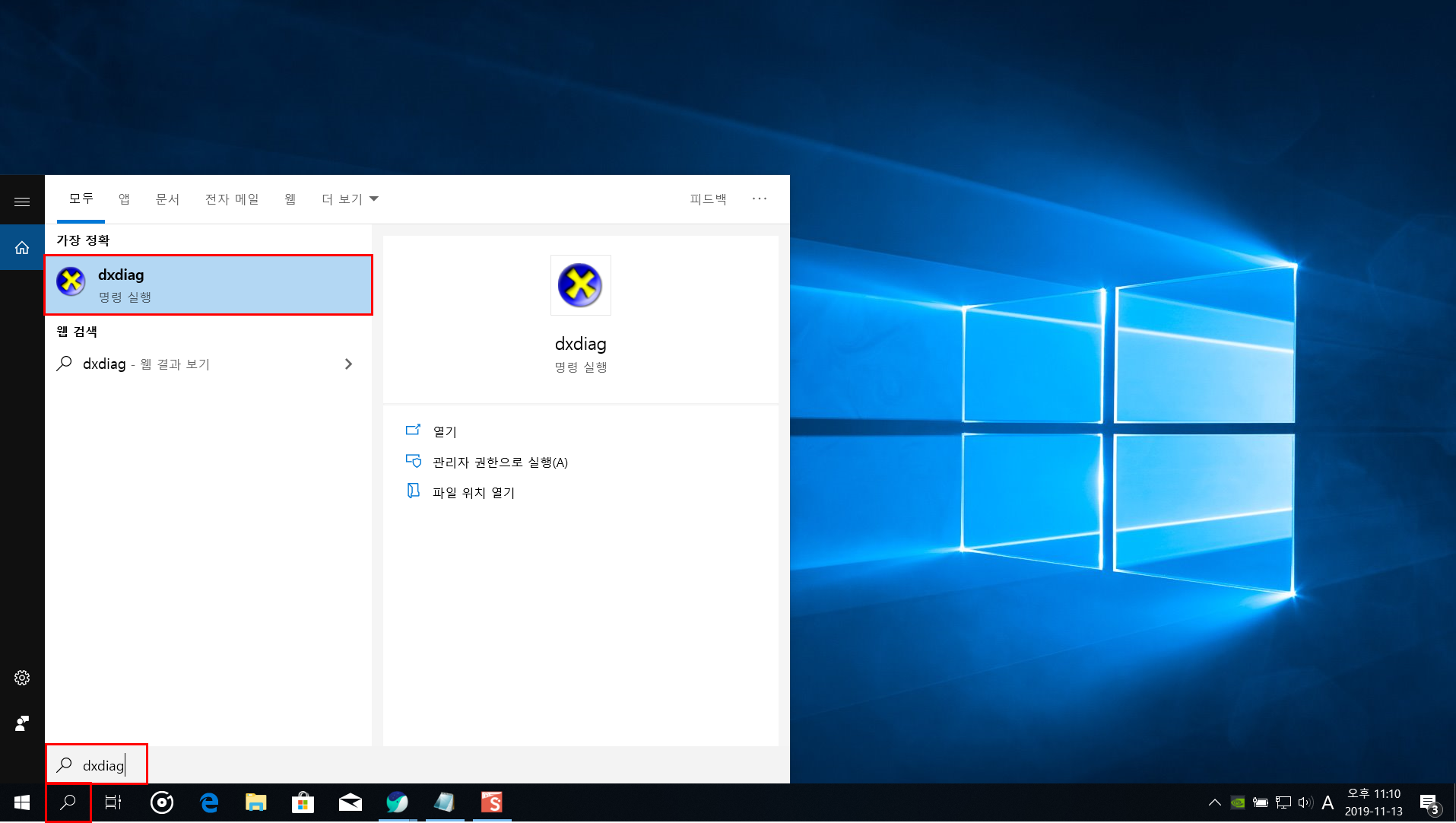 이번에는 돋보기를 눌러 준 후 dxding 를 입력합니다. 그럼 상단에 dxdiag 명령실행이라는 아이콘을 클릭합니다.