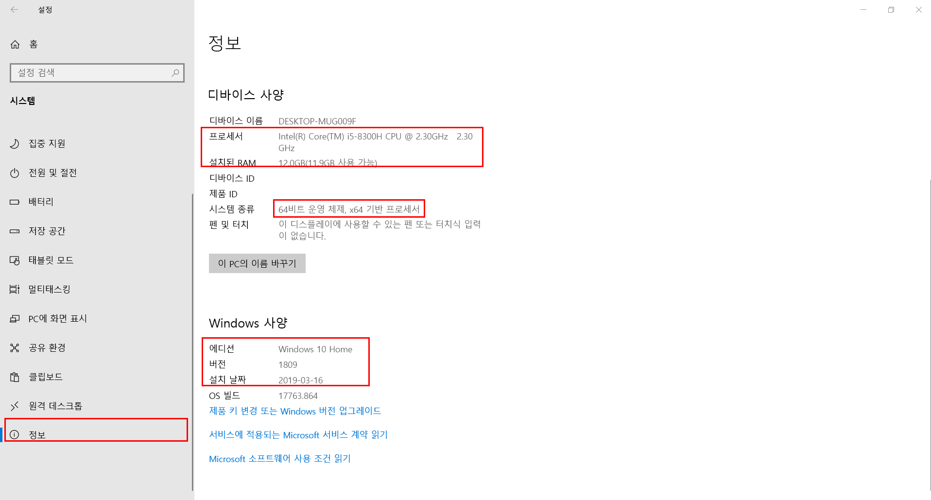 사양보는 프로그램을 다운받지 않고 시스템 설정에 들어가서 컴퓨터 사양을 간단하게 보는 방법입니다.