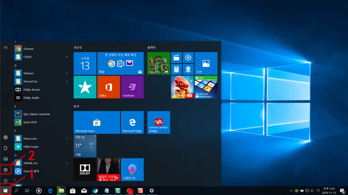 왼쪽 하단에 창문 네개가 있는 윈도우를 누르시고 시면 시작프로그램들을 볼 수 있습니다. 톱니바퀴 설정 버튼을 누릅니다.