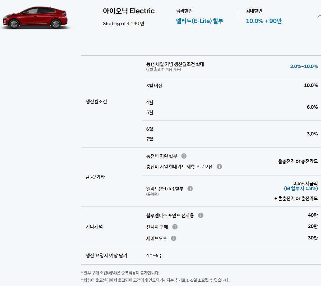 * 엘리트(E-Lite) 할부 : 2.5% 저금리 (M 할부 시 1.9%) + 홈 충전기 or 충전 카드