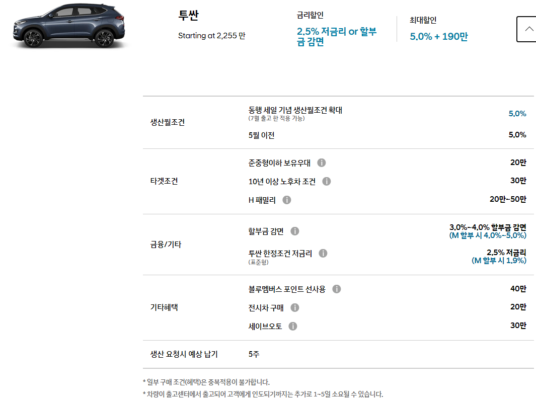 * 투싼 한정조건 저금리 : 2.5% 저금리 (M 할부 시 1.9%)