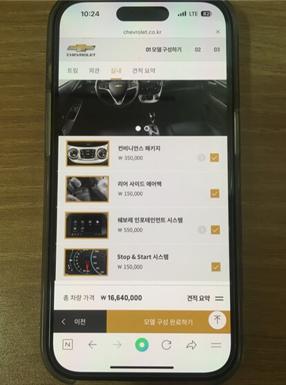 외관 옵션은 총 3가지를 추가할 수 있었습니다. 라이팅패키지, 선루프, 16인치 알로이 휠 등 이였습니다. 해당 금액은 세개 모두 추가한 값입니다.