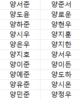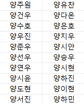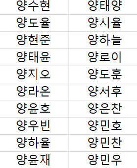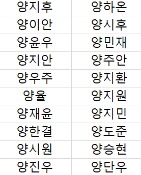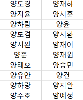 양씨 남자 이름 모음 추천 해드리겠습니다. 아기 이름 짓기, 개명 하기 좋은 이름들을 알아보고 한글, 한자 상관없이 자유롭게 작명 해보시기 바랍니다.